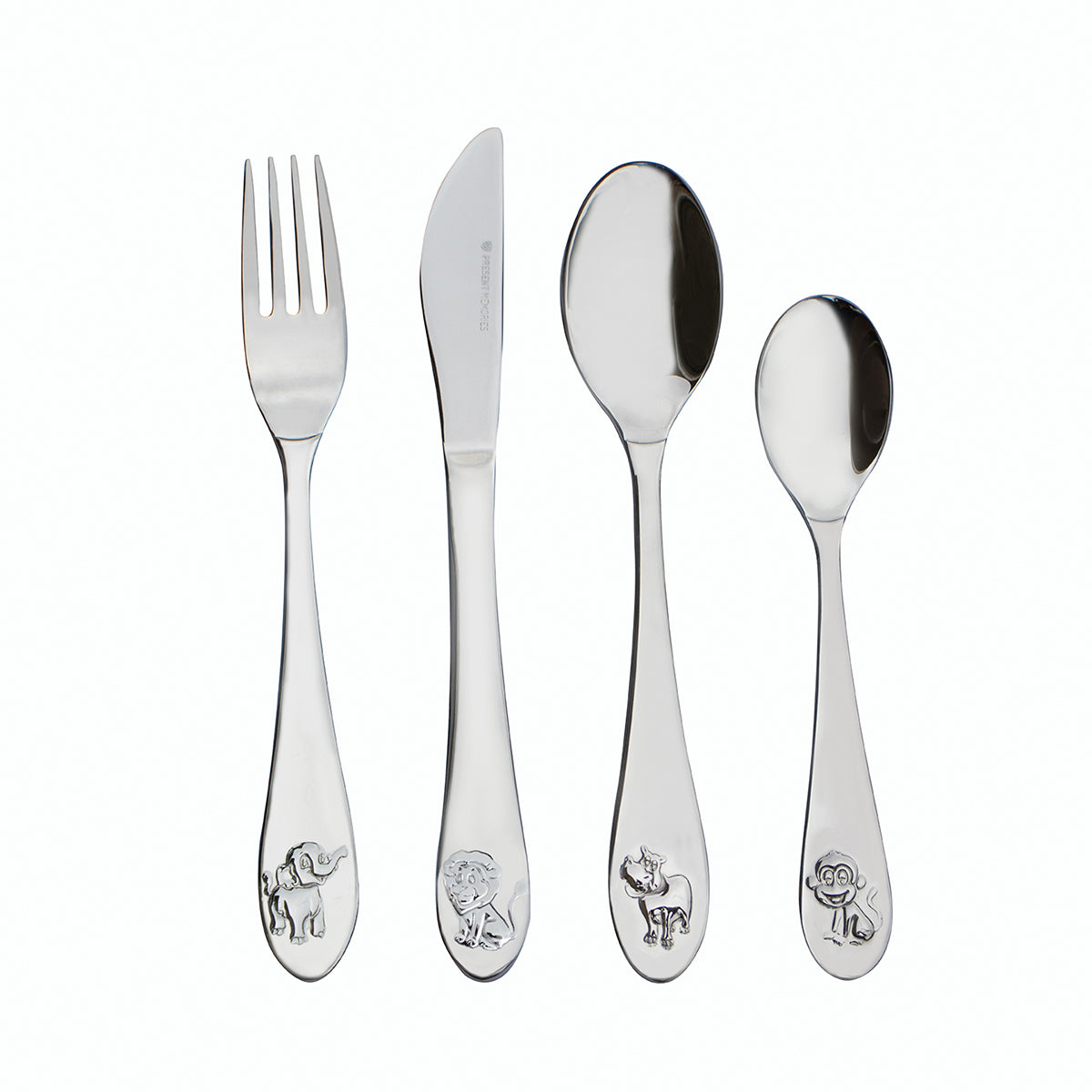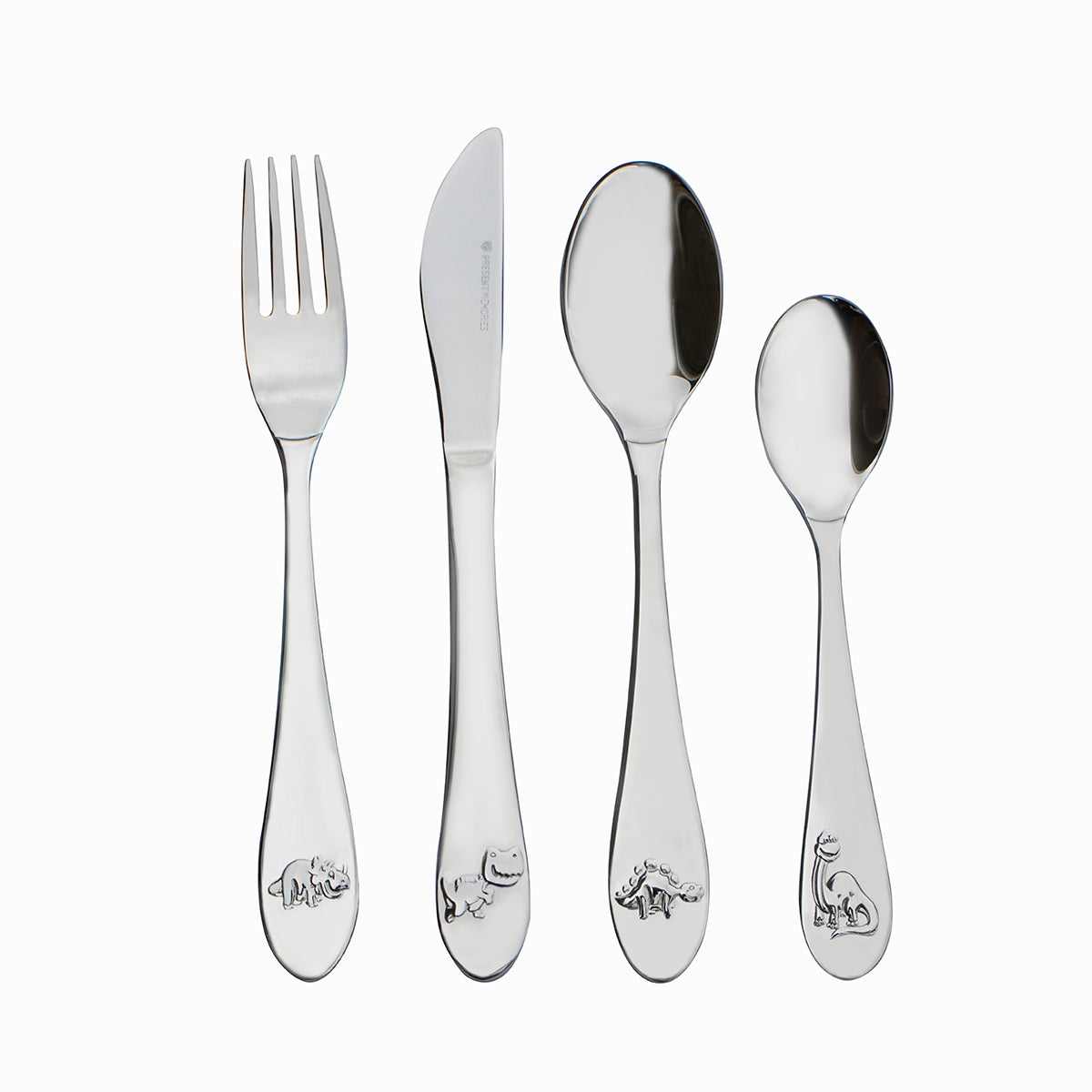 18/10 Stalen kinderbestek in een 4-delige set met superleuk dino, travel of safari thema. Leuk om aan de voor- en/of achterzijde te graveren. De set bestaat uit: een mes van 190x18mm, een vork van 172x22mm, een lepel van 170x34mm en een dessertlepel van 140x28mm.